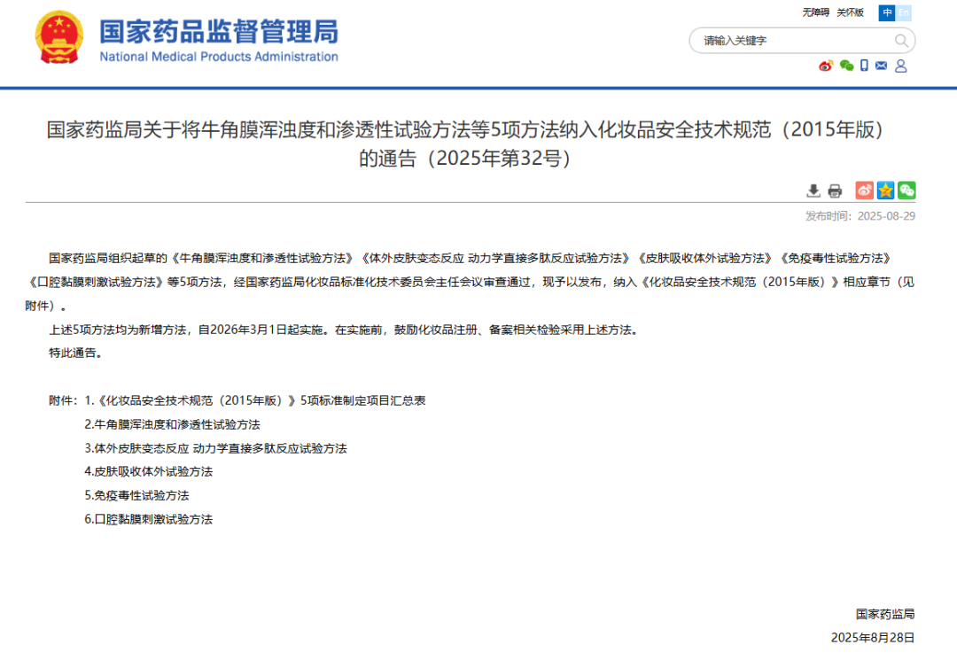 近日,国家药监局正式发布2025年第32号通告,将牛角膜浑浊度和渗透性试验方法等5项体外测试方法纳入《化妆品安全技术规范2015年版)》,自2026年3月1日起实施。这一举措标志着我国化妆品安全评估体系迈向更高水平的科学化与伦理化。