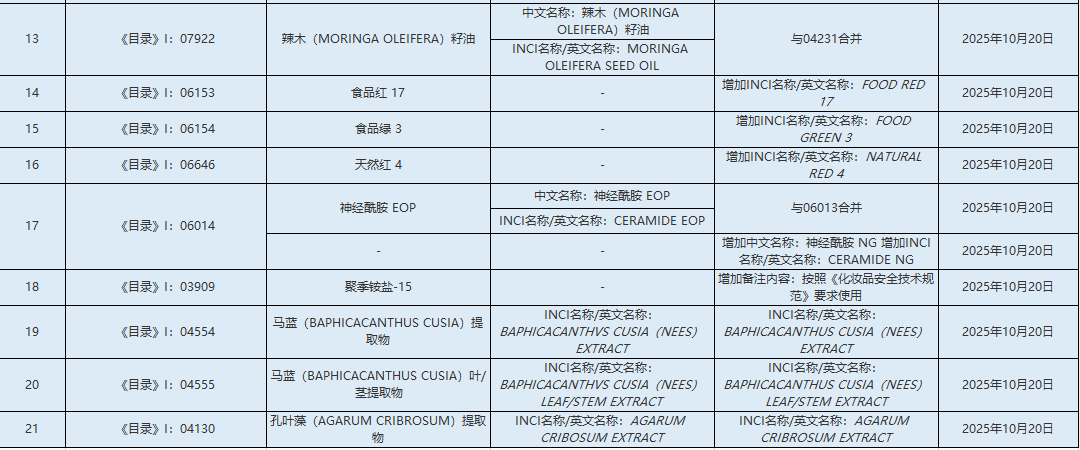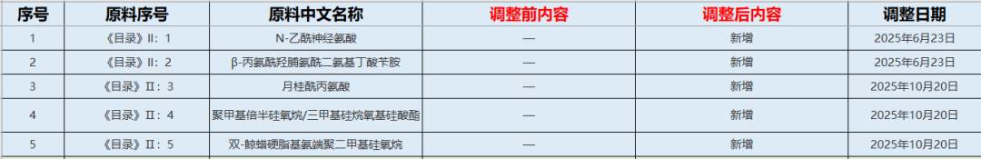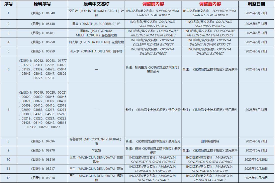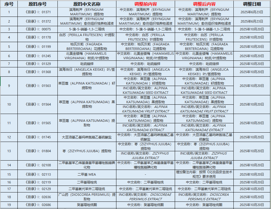 调整《目录》Ⅰ收录原料的信息及原料英文名称70个, 此调整不影响产品质量安全,不会对消费者造成误导亦不涉及产品包装标签,但企业需及时同步原料供应商更新原料报送码及COA,在产品变更备案时调整系统信息并更新安全评估报告。