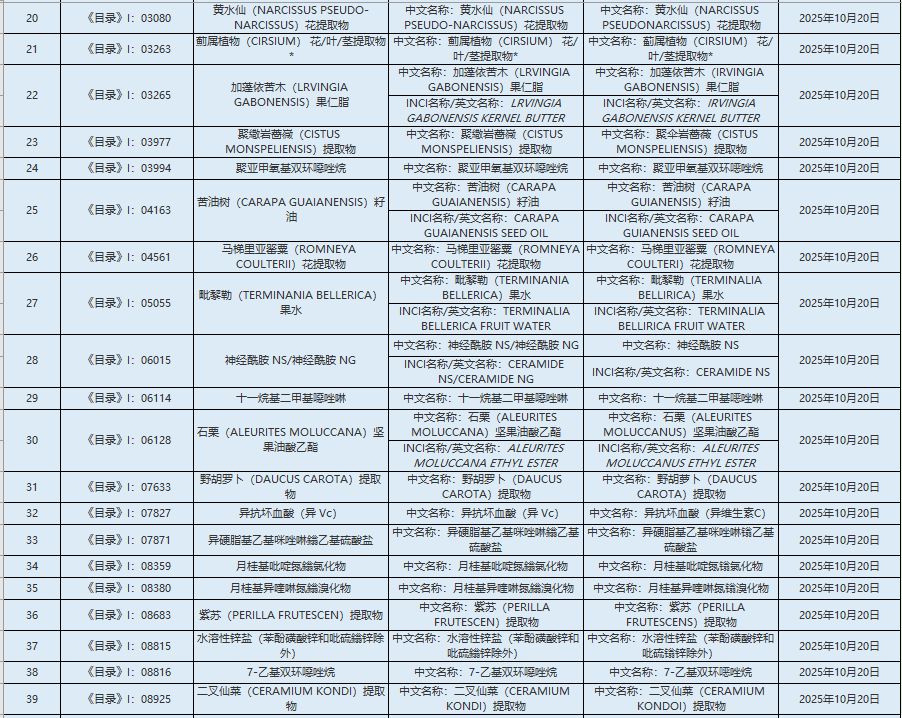 由于历史原因,截至10月20号,国家药监局对《目录》Ⅰ收录中39个原料信息完成勘误。使用该原料的化妆品注册人、备案人需要按照《化妆品注册备案资料管理规定》的有关规定变更产品标签样稿,调整产品标签。《目录》Ⅰ调整前,已上市销售的使用上述原料的化妆品可以销售到保质期结束;化妆品注册人、备案人、受托生产企业已印制的产品标签可以继续使用完。